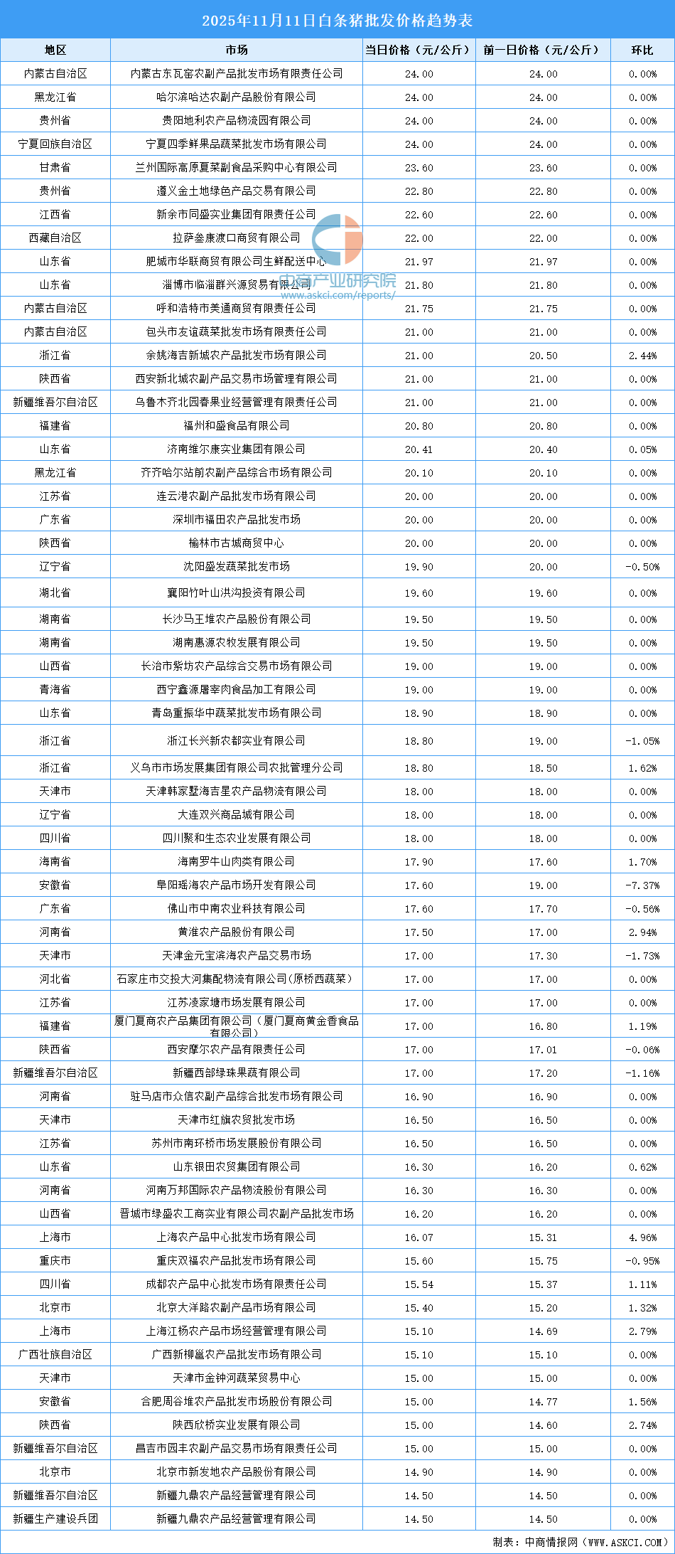 中商情报网讯:最新多个方面数据显现:11月11日全国白条猪平均价格为18.59元/公斤。其间,白条猪价格最高的商场是内蒙古东瓦窑农副产品批发商场有限责任公司、哈尔滨哈达农副产品股份有限公司、贵阳有利地势农产品物流园有限公司、宁夏四季鲜果品蔬菜批发商场有限公司,当日价格均为24.00元/公斤。白条猪价格最低的是新疆九鼎农产品经营管理有限公司,当日价格为14.50元/公斤,环比相等。